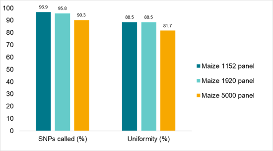 Amp-Seqアッセイの堅牢性は、キャノーラ、トウモロコシ、ソルガム、大豆、イチゴ、小麦などの作物のゲノムDNAを用い、異なるサイズのSNPパネルで評価されました。図4は、1,152、1,920、5,000個のSNPからなるトウモロコシパネルのデータを示しています。本アッセイの柔軟性と堅牢性が実証されました。