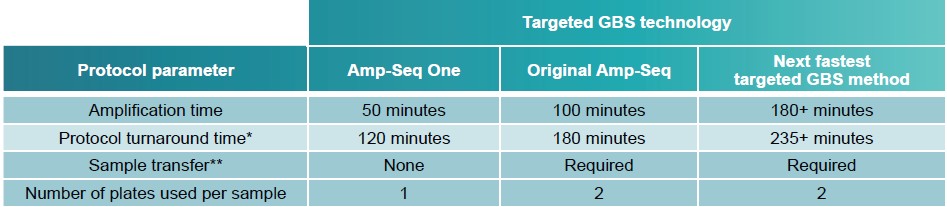 表1. Amp-Seq One(本キット), Original Amp-Seq(自社従来法)、Next fastest targeted GBS method(次に速いtGBS法)のプロトコルパラメータの概要