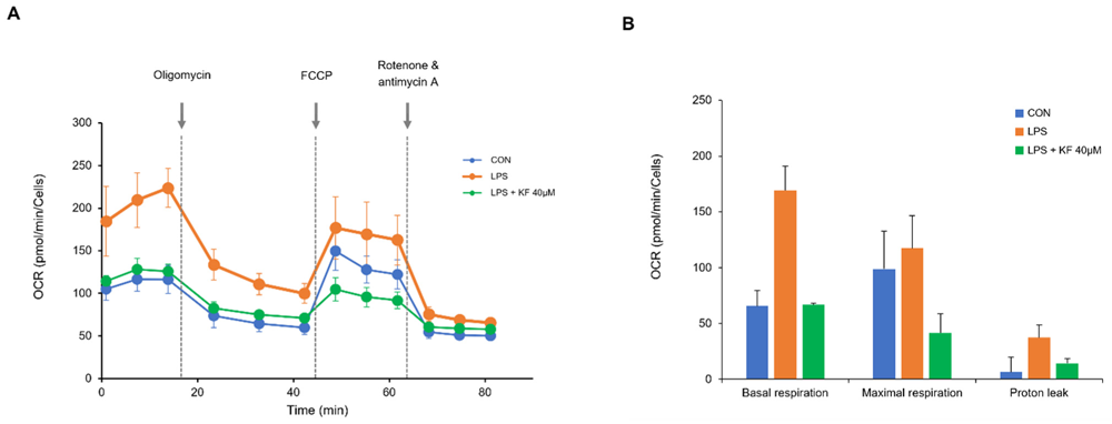 Figure:酸素消費に対するカエンフェロールとLPSの影響。OCRは代謝アナライザーを用いてリアルタイムで測定し、ミトコンドリア呼吸阻害剤を順次注入した。(A)LPSで処理した前立腺オルガノイドとカエンフェロールを併用した前立腺オルガノイドの酸素消費速度。LPS誘導群では、FCCP注入後に観察された最大OCRに比べ、基礎OCRは28%増加した。カエンフェロールとLPSの共投与は、OCRをコントロールレベルまで減少させた。(B)OCR測定により、基礎呼吸、最大呼吸、プロトンリークを同時に測定した。データは4つの独立した実験からの平均±SDを表す。興味深いことに、LPS処理により最大呼吸能が低下したため、LPS処理群ではプロトンリークが高くなった。これはLPSによるミトコンドリア損傷の徴候と考えられる。