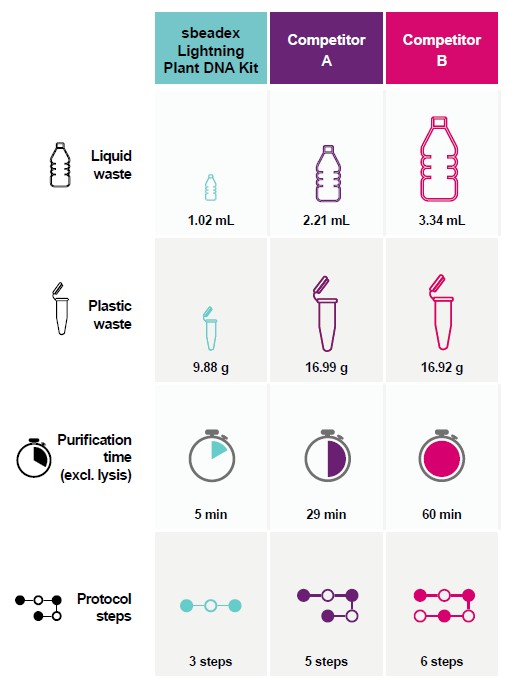 sbeadex™ Lightning は、DNAの結合と洗浄を同時に行う新しい結合原理を用いたDNA抽出キットです。植物サンプル(葉や種子)から超高速にDNAを精製します。